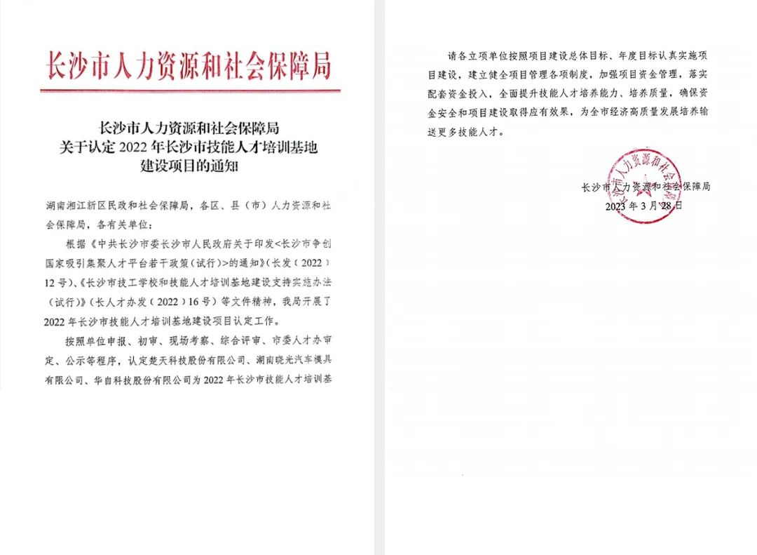 近日,长沙市人力资源和社会保障局印发《关于认定2022年长沙市技能人才培训基地建设项目的通知》,华自科技作为首批认定企业,获长沙市技能人才培训基地建设项目立项单位。本项目是长沙市争创国家吸引集聚人才平台若干政策之一,首批评选企业不超过3家。