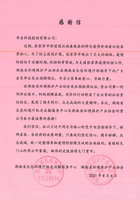 7月,新冠病毒德尔塔变异毒株出现,传播链波及南京、江苏、福建及湖南等多个省市,张家界成为疫情风险重灾区。湖湘儿女万众一心,一方有难,八方支援!在湖南省生态环境厅指导下,华自科技作为湖南省环境保护产业协会副会长单位,积极作为,向张家界捐赠一批防疫物资,用行动诠释企业价值,助力打赢疫情防控狙击战。
