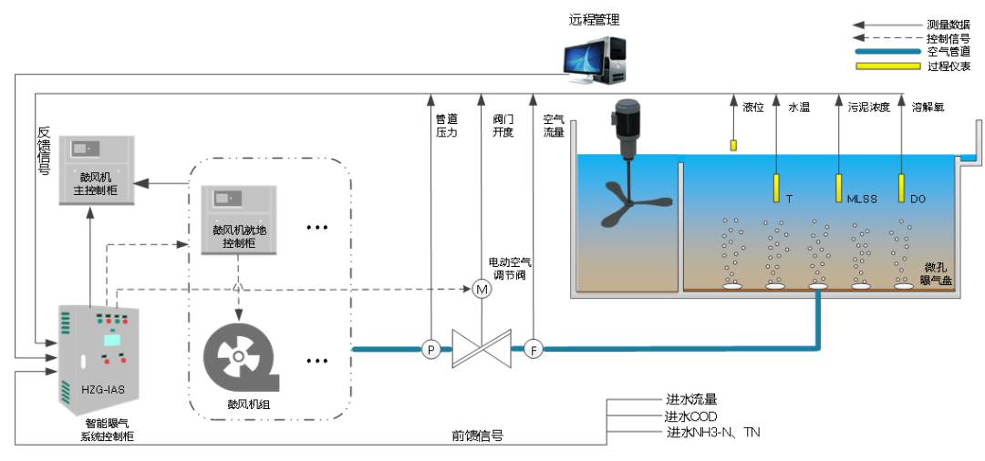 HZG-IAS智能曝气系统,优化了国际水协IWA的活性污泥数字模型ASMs,开发了模型预测控制MPC算法,对曝气量、溶解氧进行智能化、精细化及自适应控制。系统能够根据污水厂的实时进水水质、水量及生化池的关键状态变量,自动计算生化池各分区的实际需气量,并对鼓风机组和生化池曝气管路电动空气调节阀进行自动优化调节控制,按需分配各曝气控制区域的供气量。智能化的控制方式可保证生物处理过程的高效运行,并显著降低处理能耗和运营成本。同时,HZG-IAS智能曝气系统还强化了氨氮、总氮等关键污染物的处理效果,出水水质稳定,满足严格的排放及回用标准。HZG-IAS智能曝气系统的降碳减污效果显著,为污水处理厂蜕变为绿色低碳标杆厂提供了关键途径。