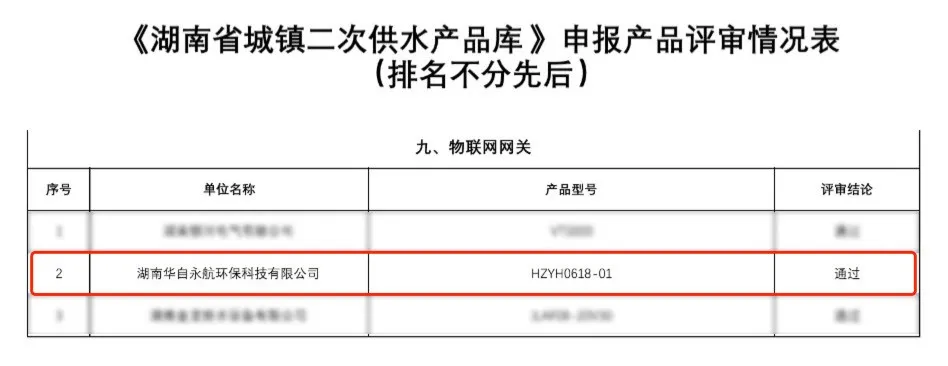 日前,华自科技子公司湖南华自永航环保科技有限公司(以下简称“华自永航”)二次供水物联网网关产品通过公示期,正式成为《湖南省城镇二次供水产品库》入库产品。