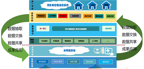 河长制信息化管理平台以数据平台、网络平台和应用平台三个平台为框架,集成河湖信息、河长信息、实时动态监测数据(如水位、水质等)、实时视频等,构建动态治水、管治合一的综合河道监督治理平台。平台还整合水利、环保等业务部门的基础数据、监测数据和监控视频,实现“互联网+”跨行业水利业务应用,基于一张图展示,实现对基础设施的精准管理、动态监控和高效维护,提高河道业务管理能力和对外服务能力。