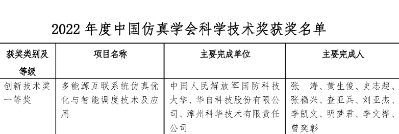 8月4日,中国仿真学会发布《2022年度中国仿真学会科学技术奖获奖名单》,由国防科技大学、华自科技、漳州科华技术有限责任公司合作完成的“多能源互联系统仿真优化与智能调度技术及应用”项目荣获中国仿真学会科学技术奖-创新技术奖一等奖。