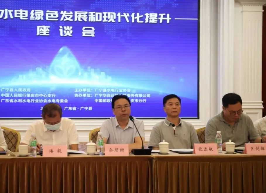 为积极开展小水电绿色发展示范区建设,持续探索“十四五”期间农村水电绿色发展新格局、新模式及长效机制,全面推进小水电转型升级、绿色发展,6月23日,在广宁县人民政府、中国人民银行肇庆市中心支行、广东省水利水电行业协会水电专委会的指导下,由广宁县水电行业协会主办,广宁华自运维科技服务有限公司、中国邮政储蓄银行肇庆市分行协办的广东小水电绿色发展和现代化提升座谈会在广宁县召开。广东省水利厅、肇庆市水利局、广宁县人民政府、广宁县水利局、广东省水利水电行业协会、中国人民银行肇庆市分行及广宁支行、中国邮政储蓄银行肇庆市分行及广宁支行领导以及全国相关省/市县小水电行业协会、设计院、电站、企业负责人、专家逾百人参加会议。华自科技总裁佘朋鲋、总裁助理兼湖南华自运维科技服务有限公司总经理李满玉、广宁华自运维公司董事长刘利军等代表出席会议。